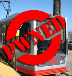 A picture of a MUNI Metro Breda Train Car with the words ‘pwned’ (PWNED) superimposed in a red stencil text font to signify the MUNI Metro T-Third line’s criminal inferiority compared to other modern light rail systems. Note, the original picture is actually an N-Judah train.